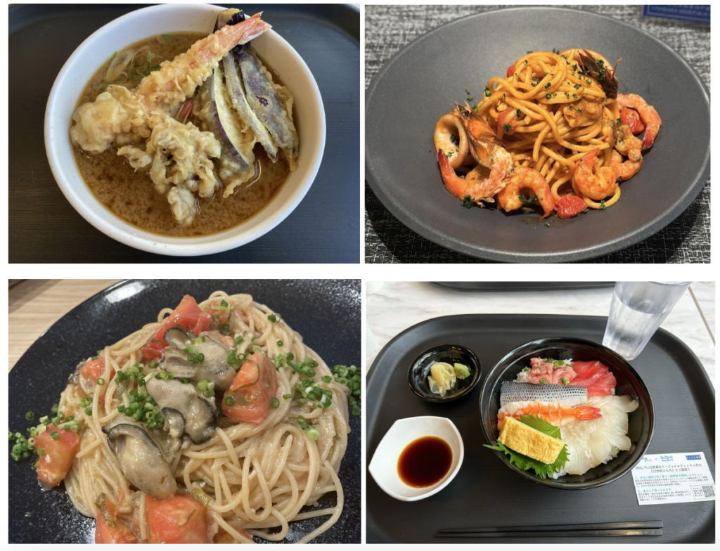 〈メニュー名〉左上:天ぷら盛り付き 海老みそうどん、右上:魚介のペスカトーレ、左下:牡蠣とトマトの中華風スパゲッティ、右下:海鮮丼